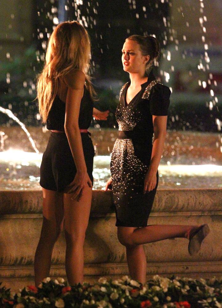 I just love the look that Blair and Serena portray in this scene of Gossip Girl (Season 4, Episode 1) Serena is wearing a beautiful sparkly cage dress (very Lady Gaga-like) layered on top of a simple, sleek, white dress, and tops it off with a grey boyfriend blazer. She accesorised with a panama hat and brogues. Blair is wearing an enchanting printed dress (by Moschino), and accesorised her look with a beret and high heels.